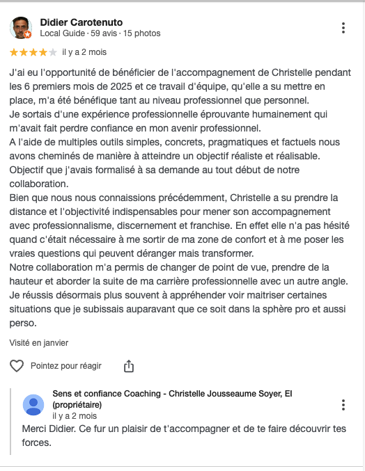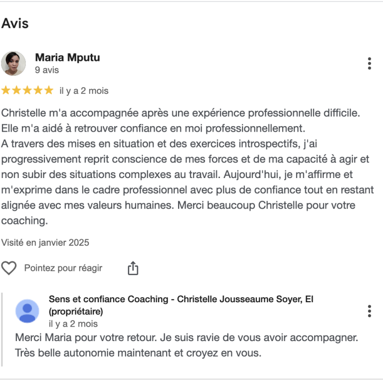 "Je reprends ma place, j'agis autrement et je retrouve confiance sans me perdre et avec efficacité", `